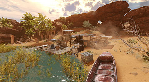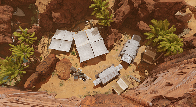 The environmet is centered around the oasis and its exotic natural surroundings. The river and the waterfall serve as great landmarks and contrast to the otherwise barren cliff-sides and sandy topography. Short and dry trees are scattered across, green and tall ones reserved only for select areas with plenty of access to water.