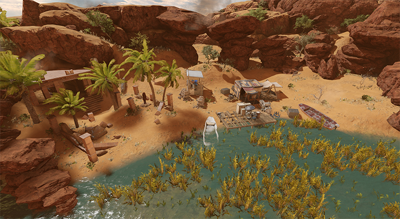 There are three distinct historical layers to the environment: (1) Ancient ruins that dot the oasis, (2) Recently overrun archeological site and civillian remains, (3) Current military presence, fortifications and signs of active combat.